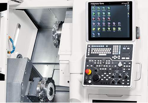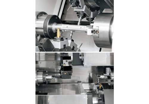 • Simultaneous cutting with upper and lower tools on L/R opposed-spindles ensures balanced processes and faster cycle times.