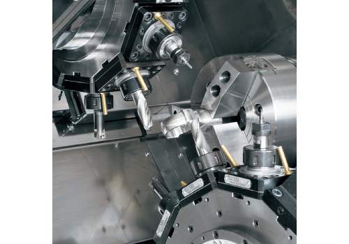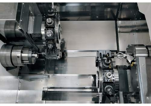 - Simultaneous cutting with upper and lower tools on L/R opposed-spindles ensures balanced processes and faster cycle times.